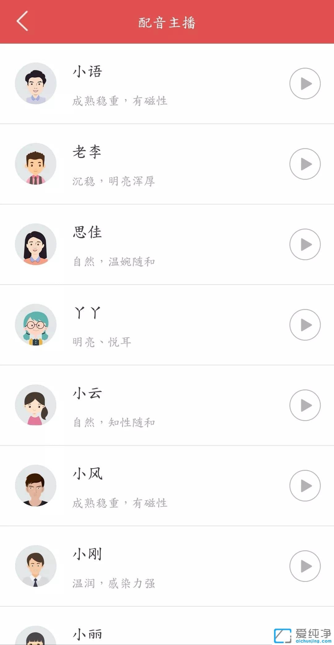 接着选择主播,主播多达75种类型,有成熟稳定的、有磁性的,有自然、温婉随和的,有明亮、悦耳的,有童声、稚嫩可爱的,有可爱甜美、动听,根据需求选择好配音主播。