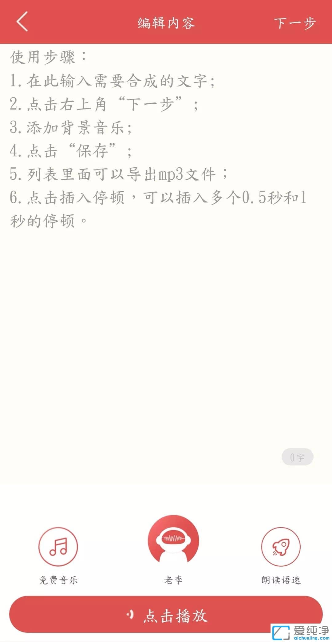 核心的文字转语音的功能,点击软件底部“ ”号,即可输入或者直接复制粘贴想要转换语音的文字内容,经萝卜哥测试暂无发现转换有文字上线。